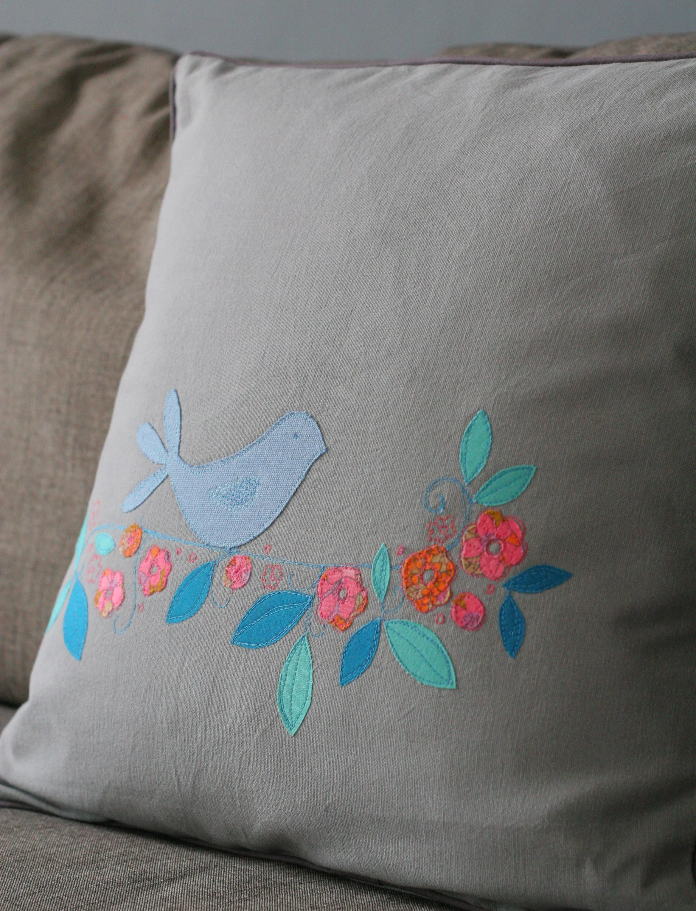 Some free-motion applique on a cushion. This was used as an example for one of our Free-Motion Workshops.