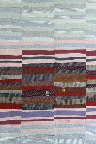 Another trait of the Gees Bend quilters was the practical use of what they had to hand. Without the money for new fabrics, they generally used scraps. And even today, some people who can afford new materials, are still making quilts in this way. Incorporating memories into something that will last a lifetime, or even beyond: the clothing scraps of a loved one, the baby clothes of a child now grown up, or the fabric stash of someone who's passed on.